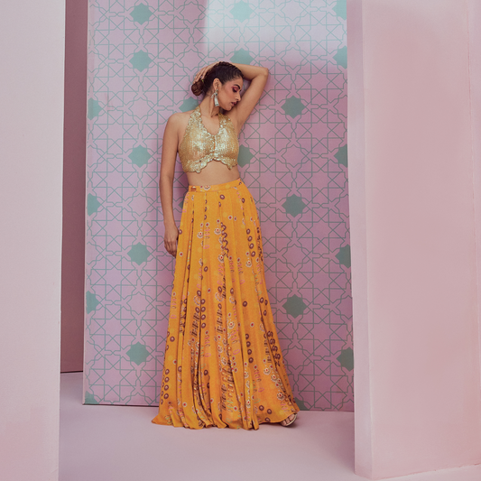 Sequence blouse paired with yellow flared lehenga