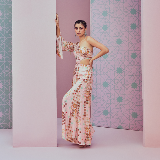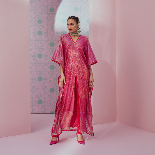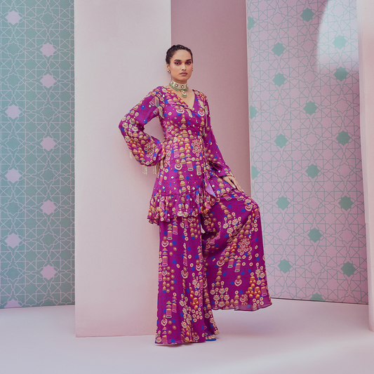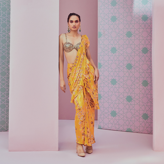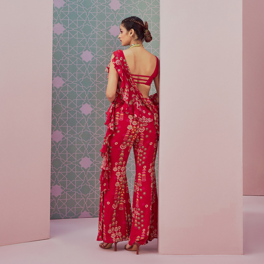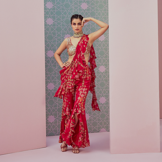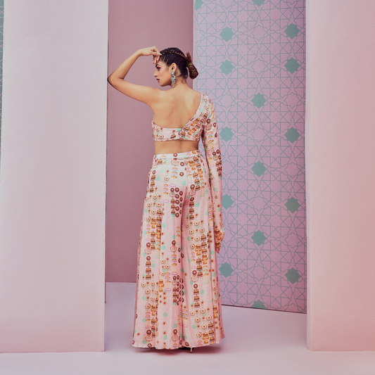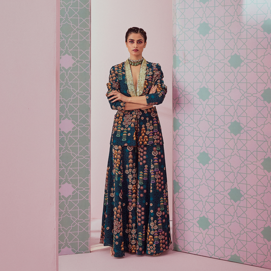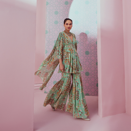Embellished blouse paired with emerald green full length cape & slit skirt
