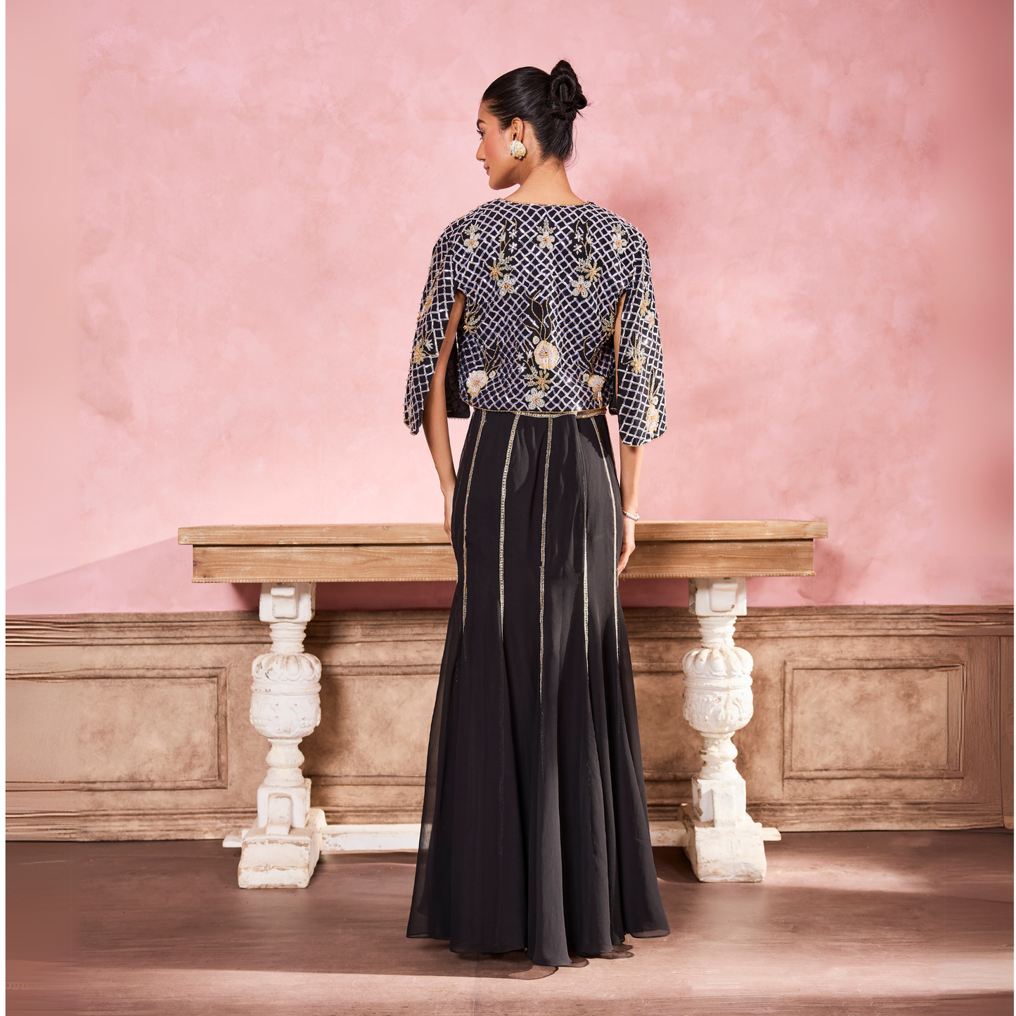 Black Georgette Embroidery Open Cape Set