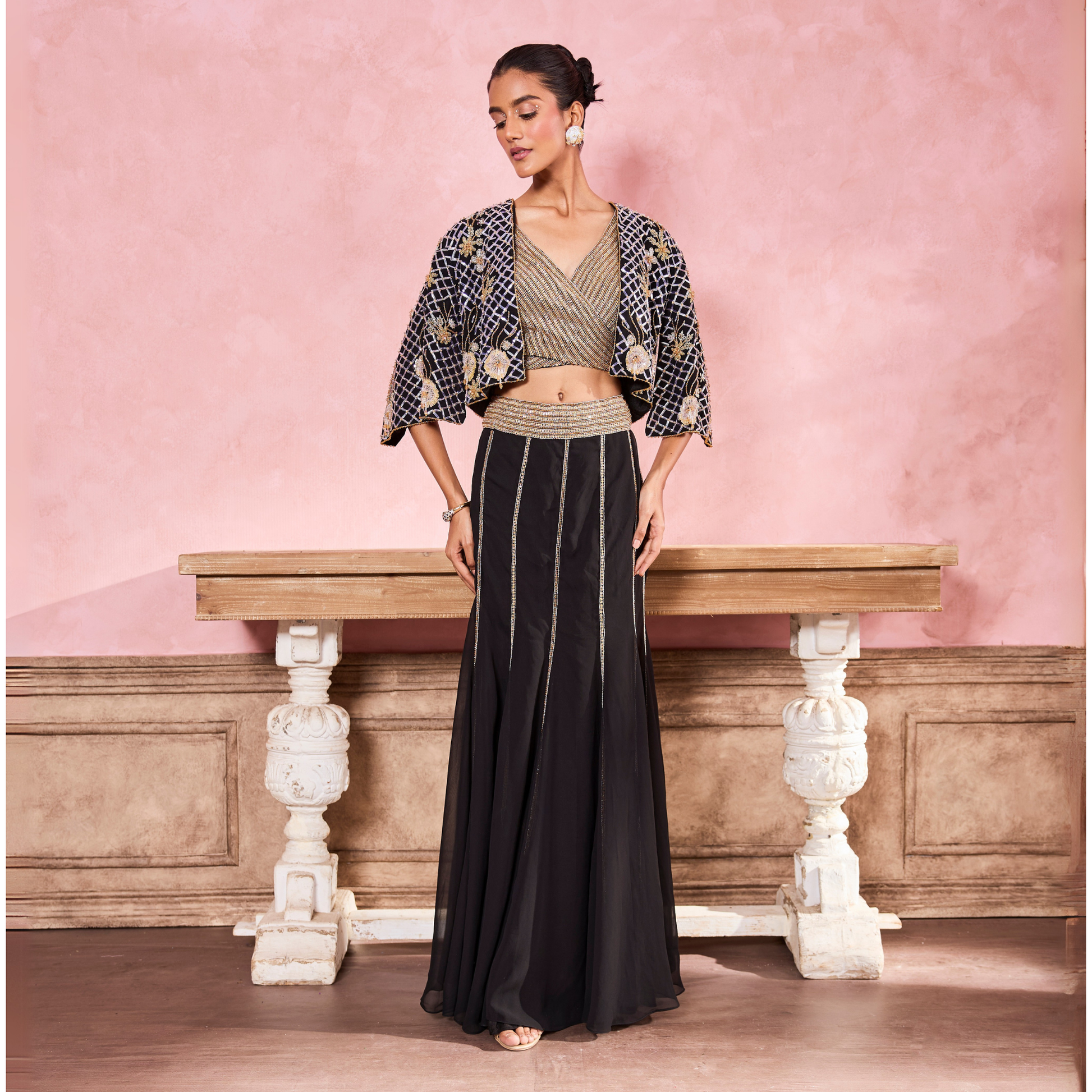 This open cape is embroidered with sequins, cutdana, crystals, stones & beads. Paired with an embroidered blouse & fish cut skirt.