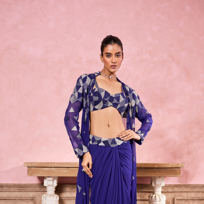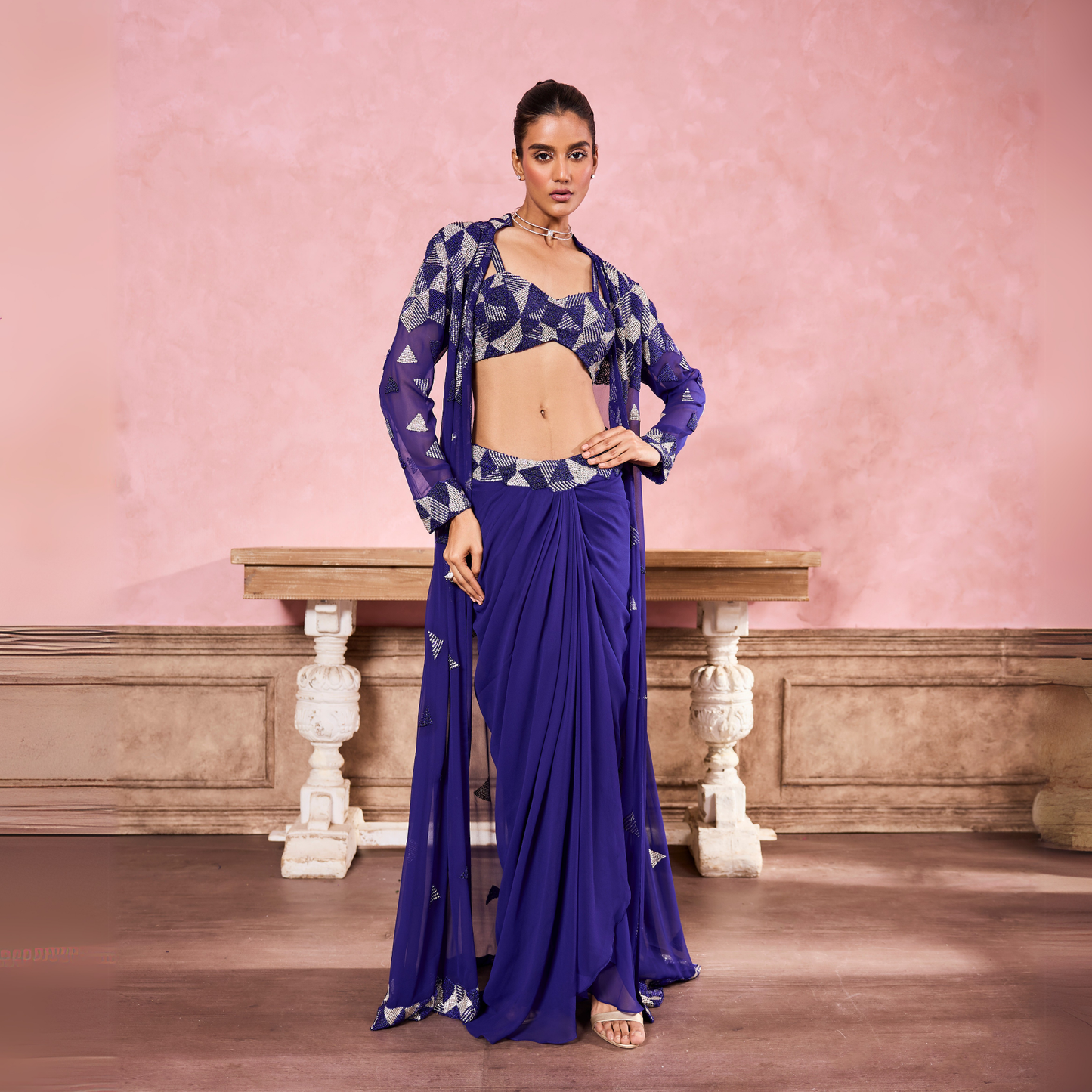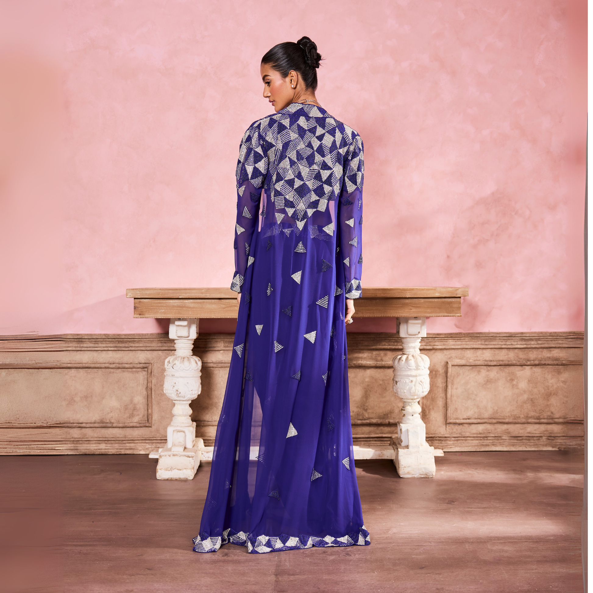 Blue 3D diamond embroidered cape & blouse with handwork of beads & stones. The skirt is embroidered at the waist.