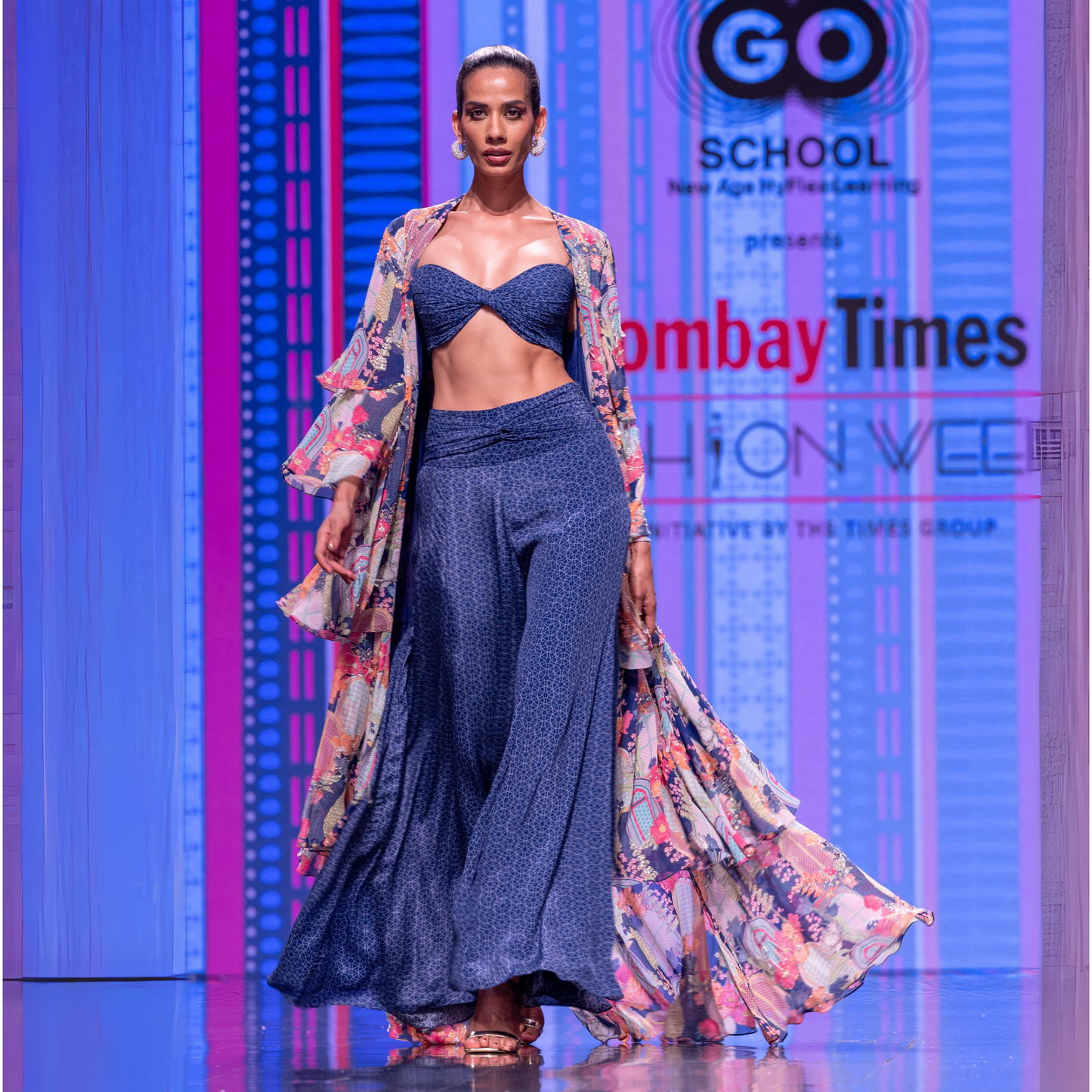 Blue printed blouse paired with sharara & embellished ruffle cape
