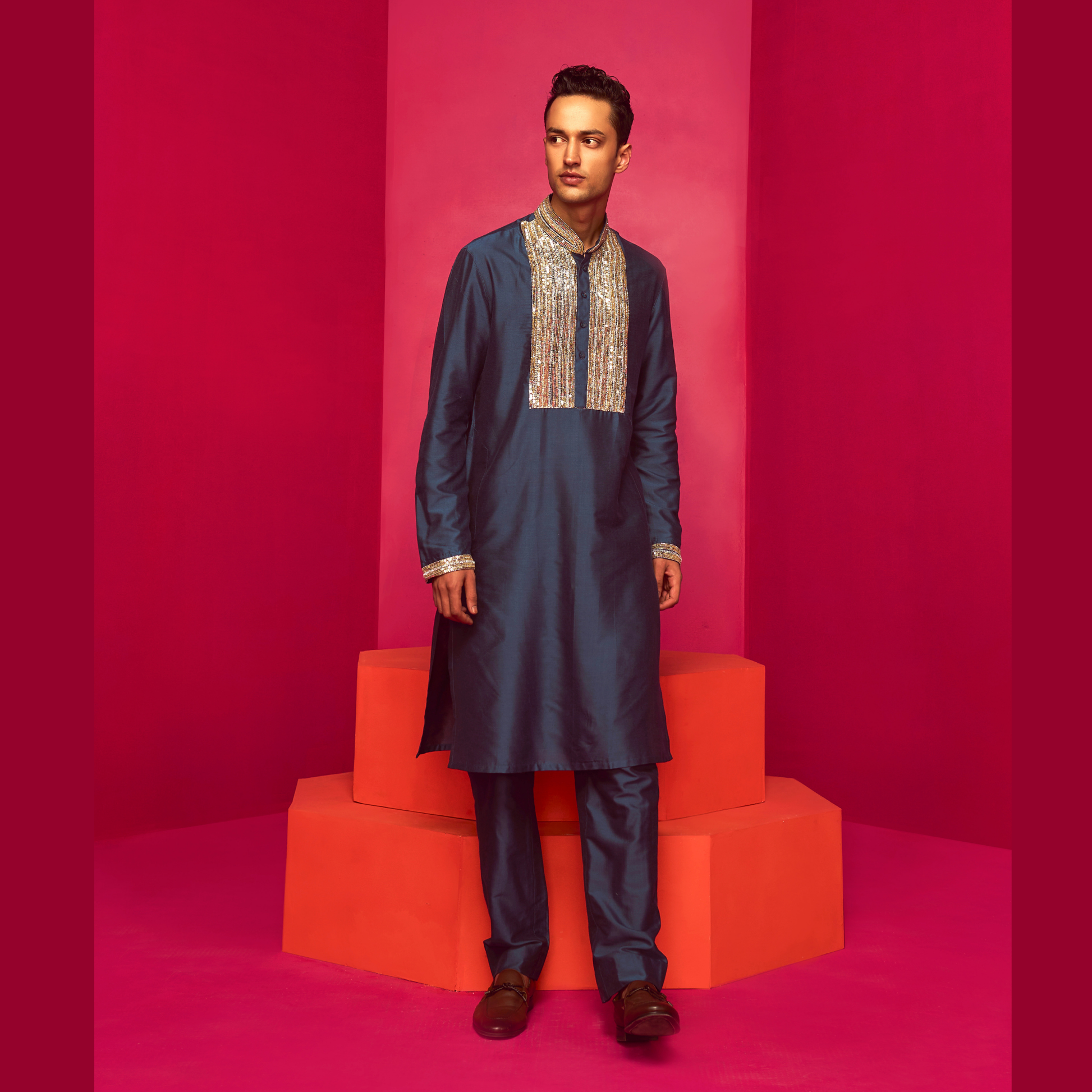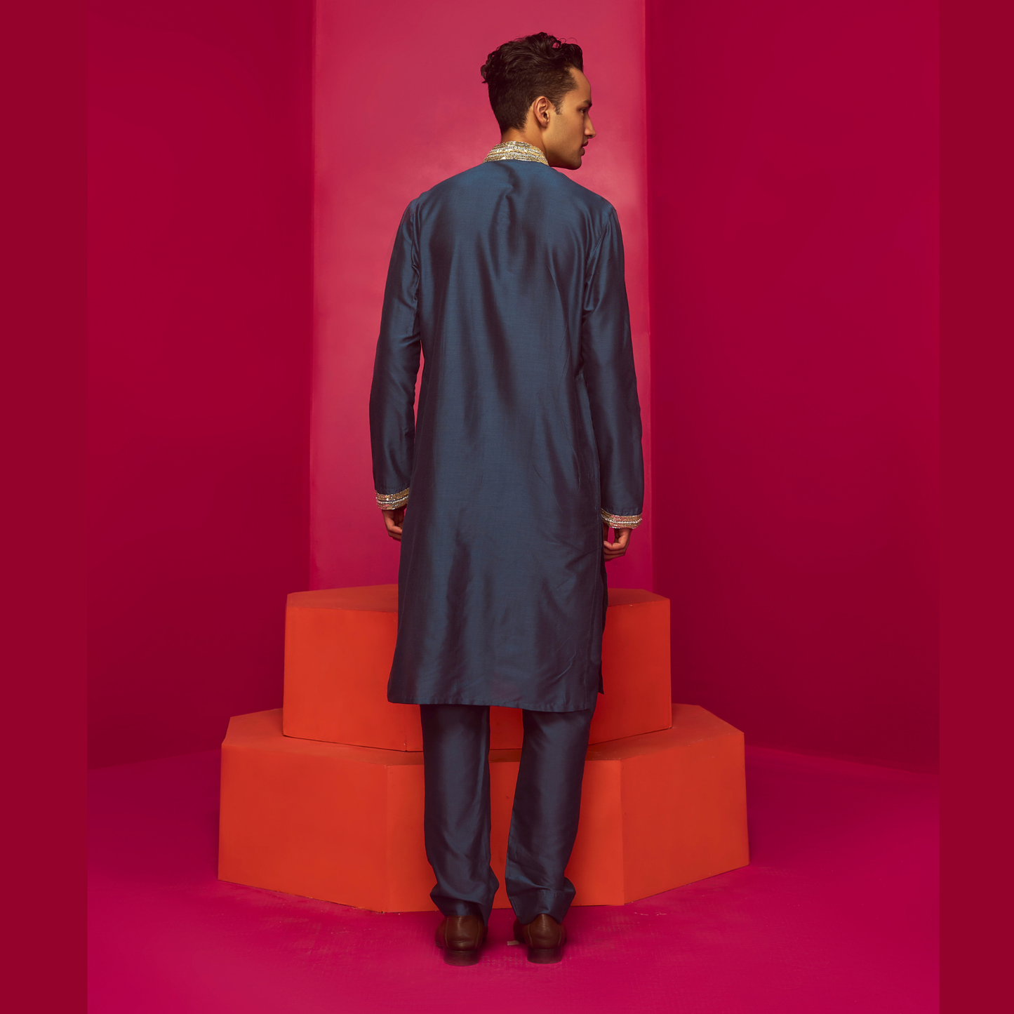 Expertly crafted from a luxurious blend of cotton and silk, this Blue Kurta Set exudes elegance and comfort.