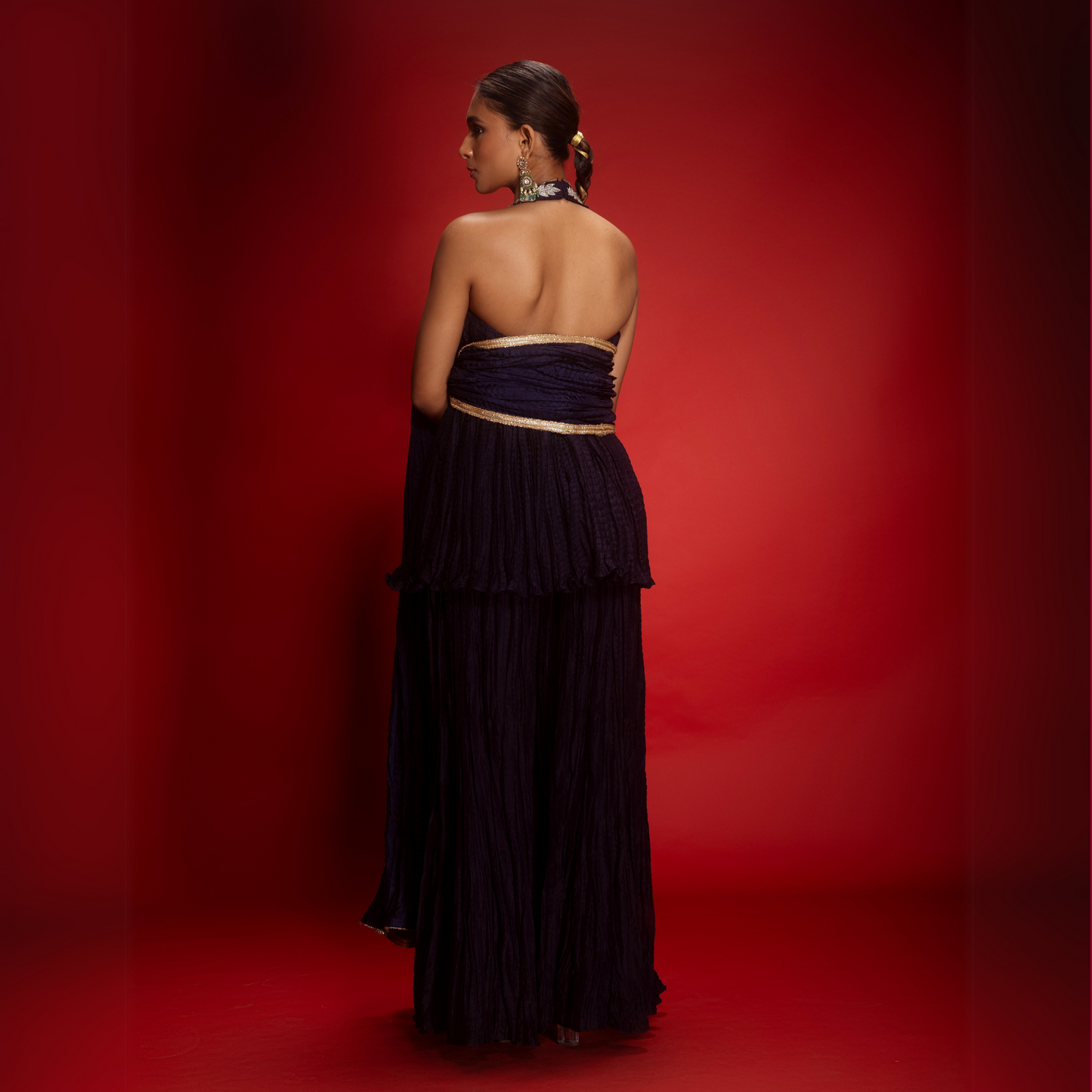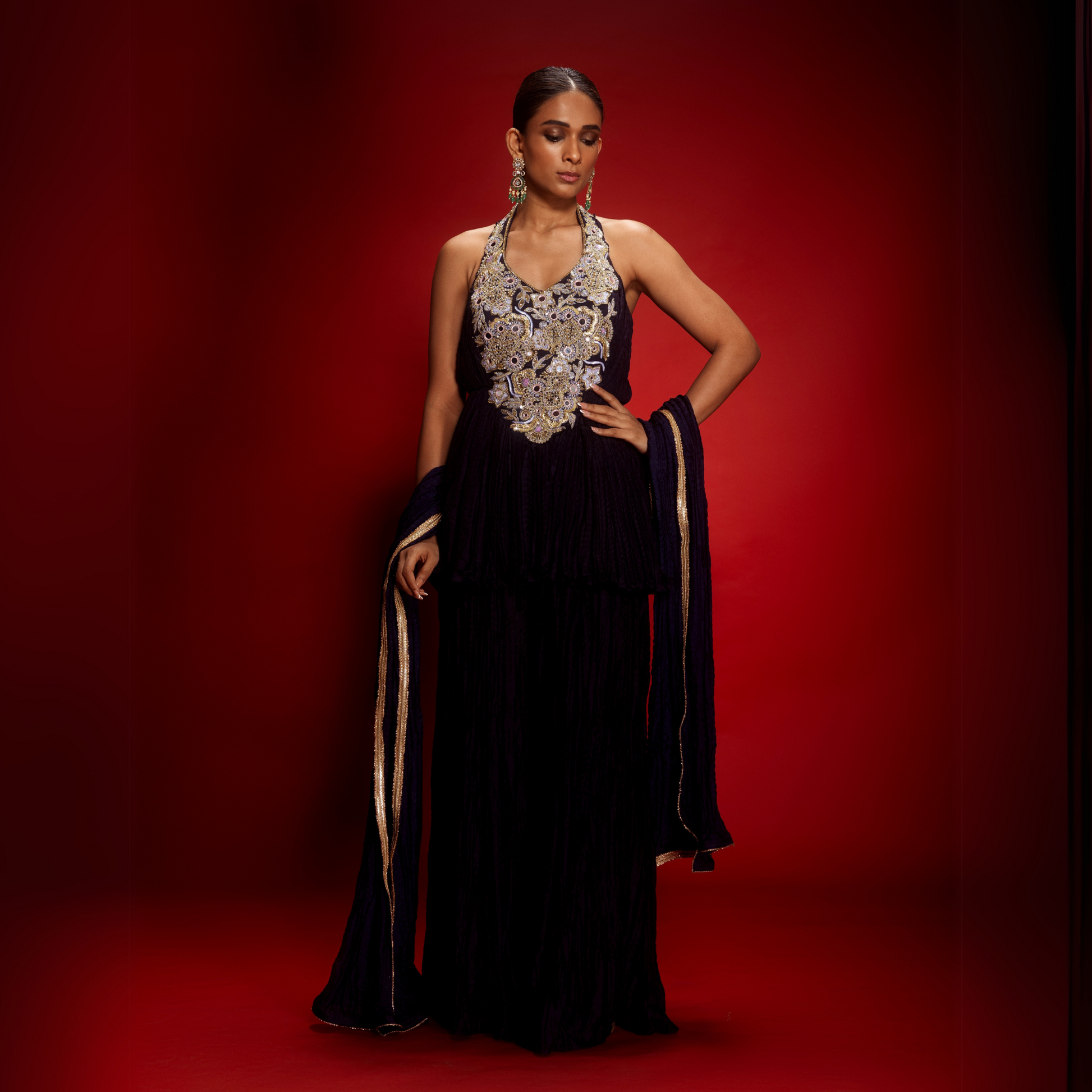 Blue crush silk halter neck kurta with beads, sequence, cutdana, salli, mirrors & zari work. Paired with sharara & gota patti dupatta