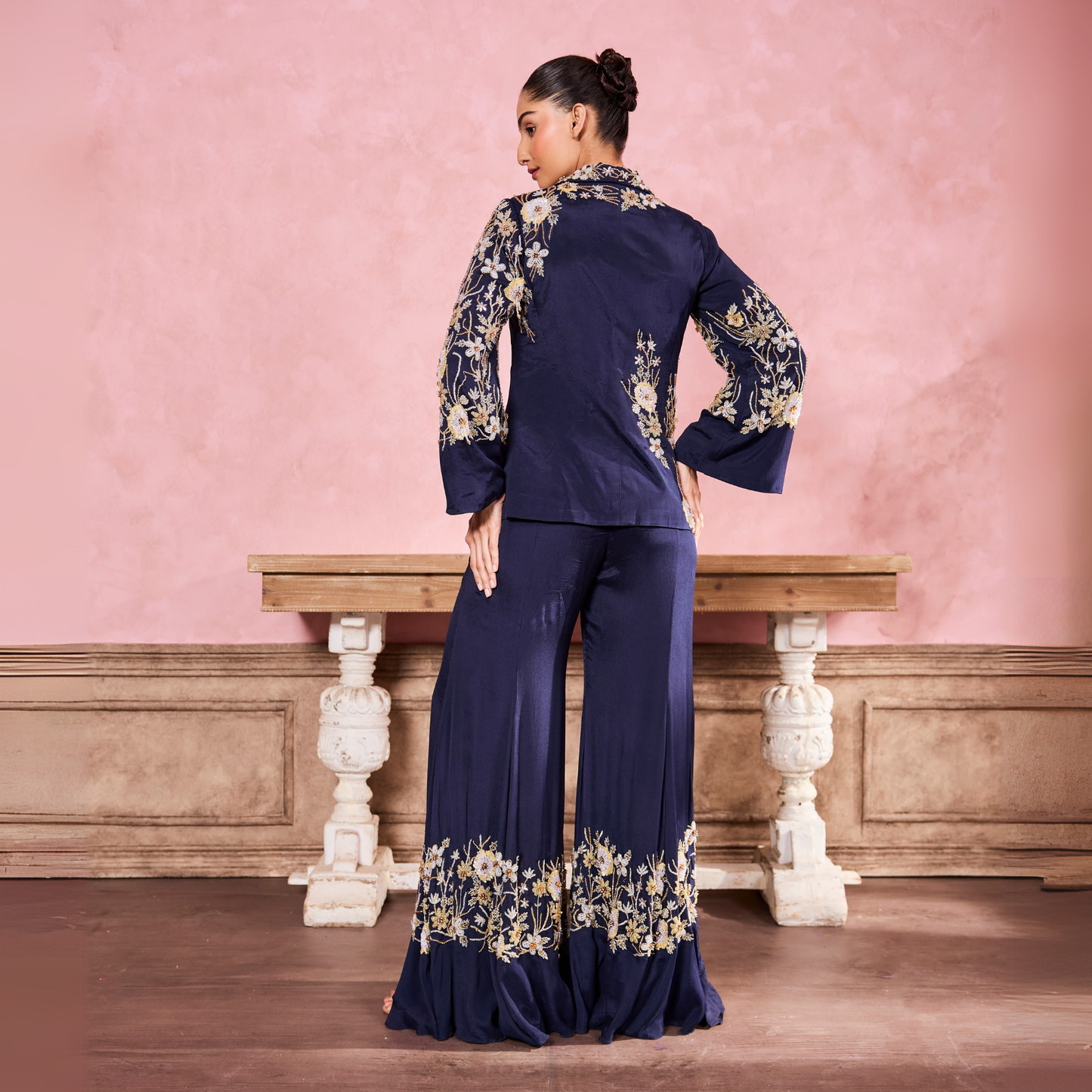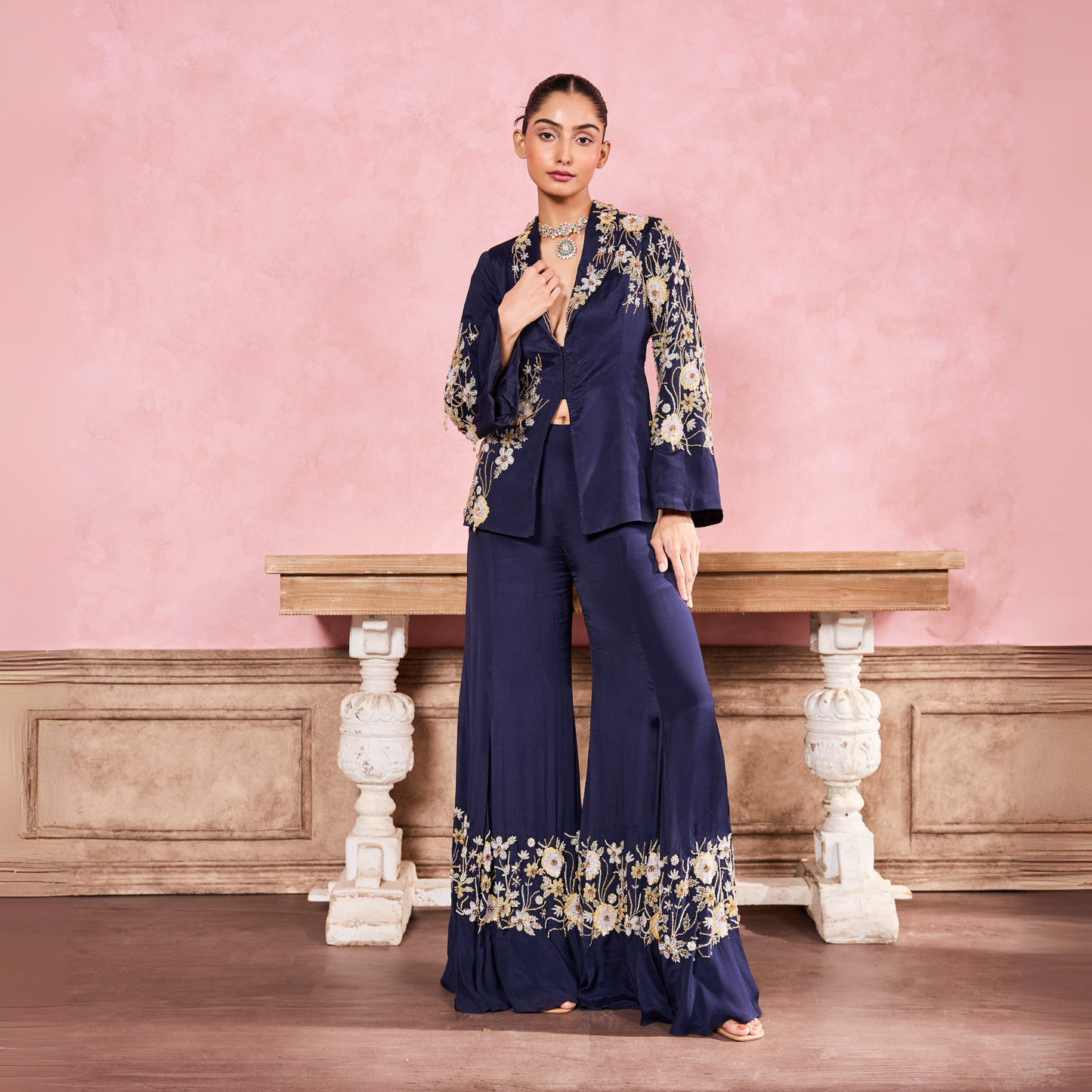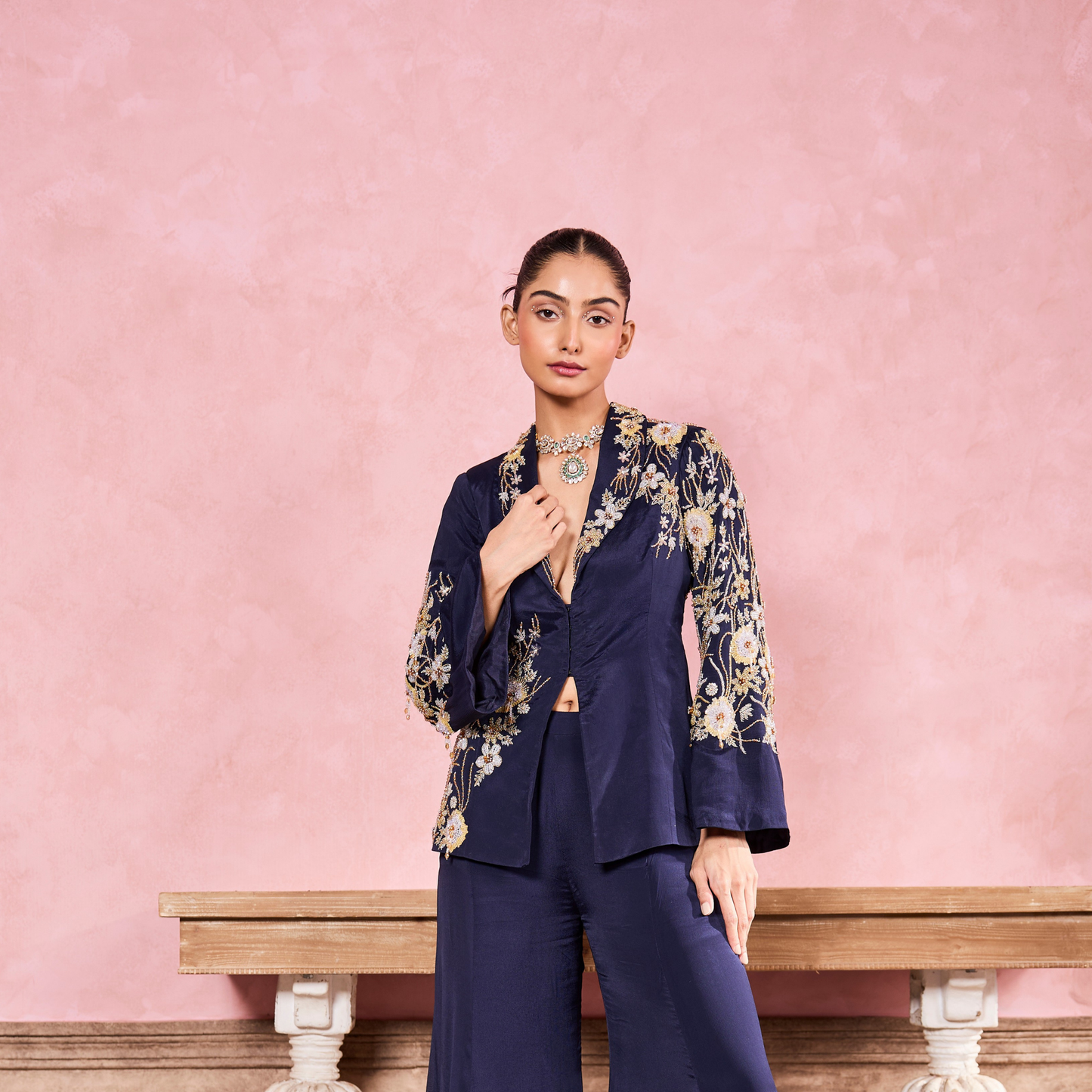 This blue blazer set is floral embroidered with sequins, cutdana, beads & stones work. Paired with a flared embroidered pants.