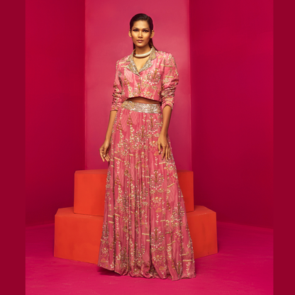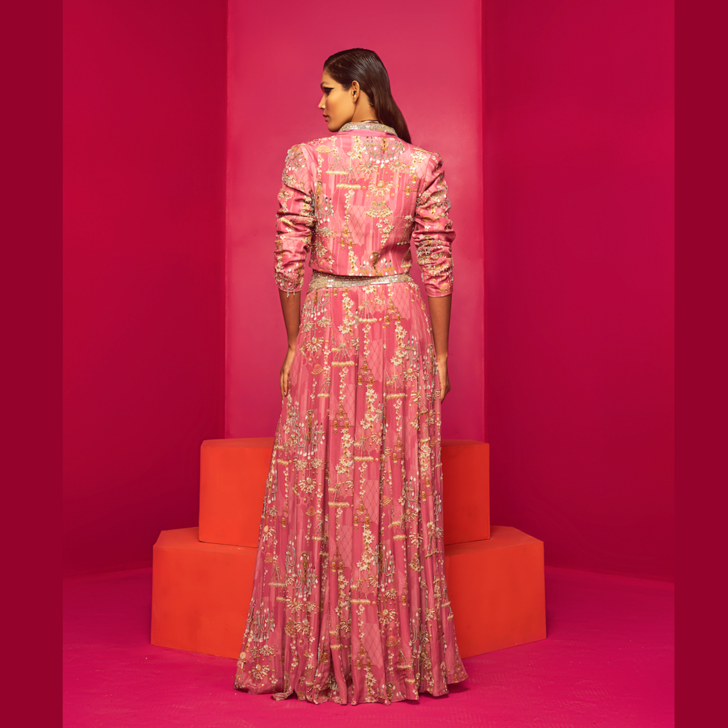 Blush pink crop jacket paired with embellished and embroidered lehenga
