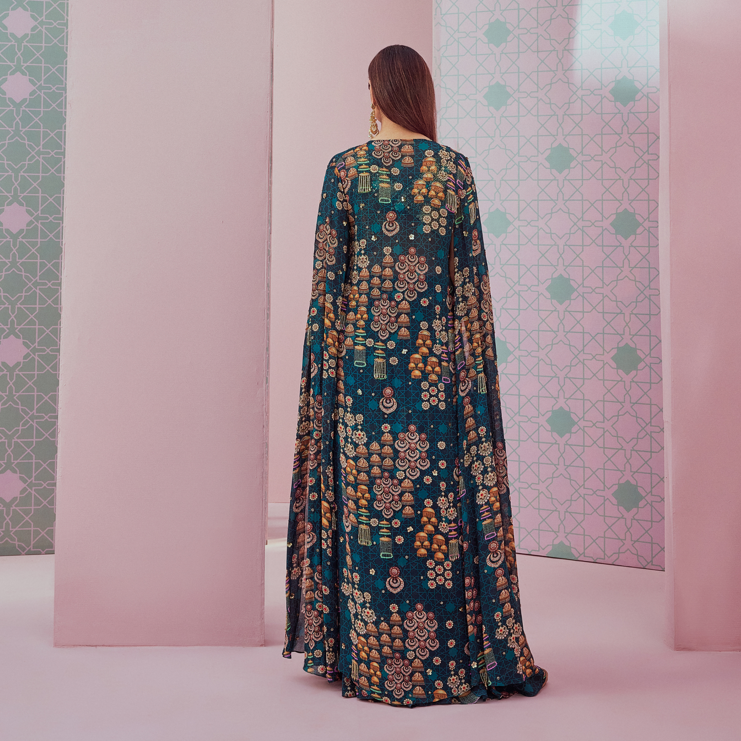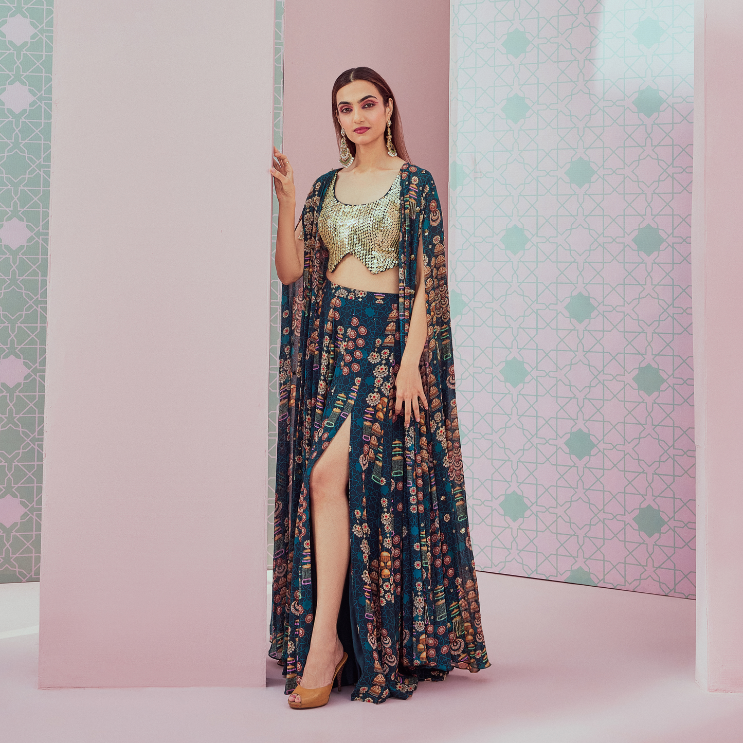 Embellished blouse paired with emerald green full length cape & slit skirt
