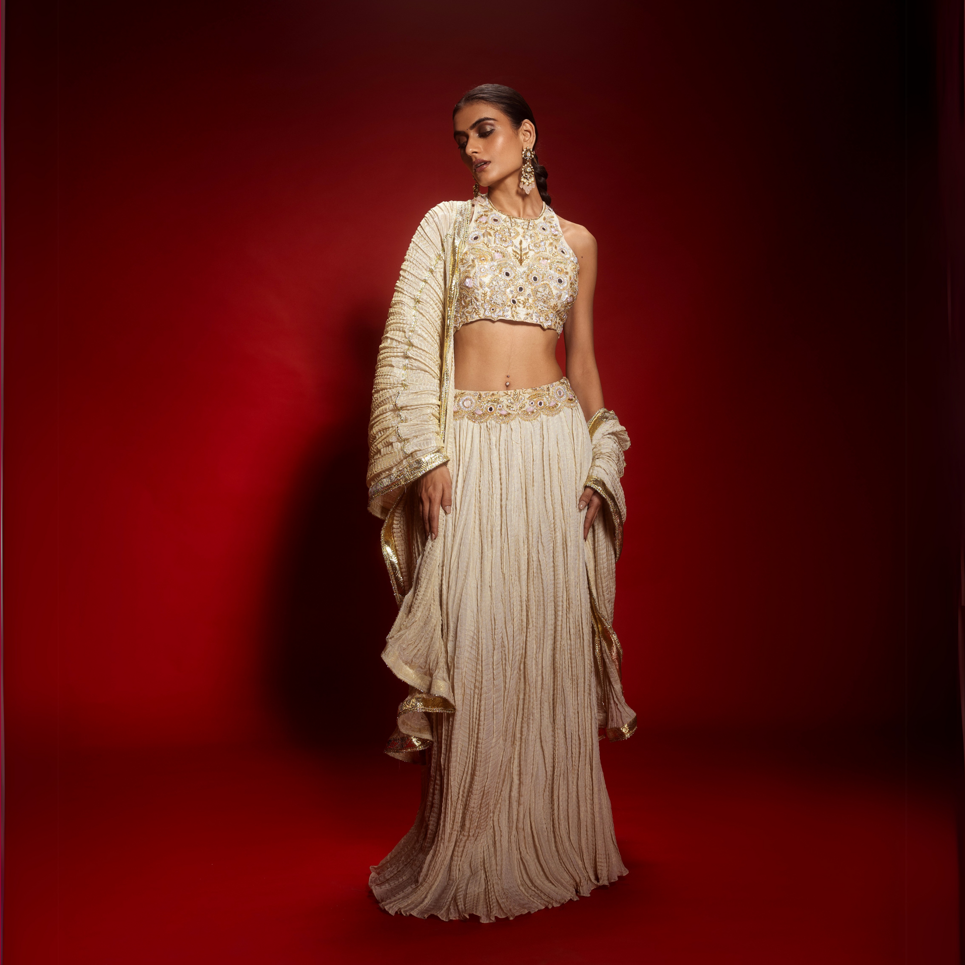 Ivory crush silk lehenga with sequence, cutdana, mirror & zari embroidery at the waist and on the round neck blouse. Comes with a gota patti dupatta.