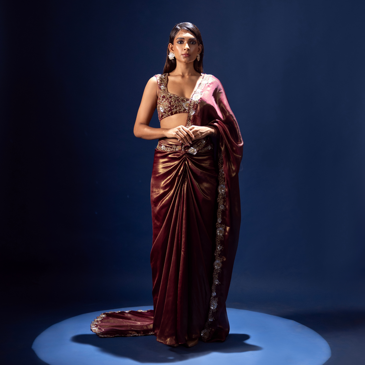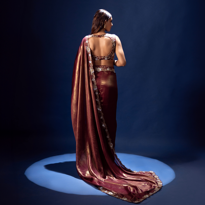 Maroon pre-draped shimmer satin georgette saree with beads, cutdana, mirrors embroidery paired with halter neck blouse.