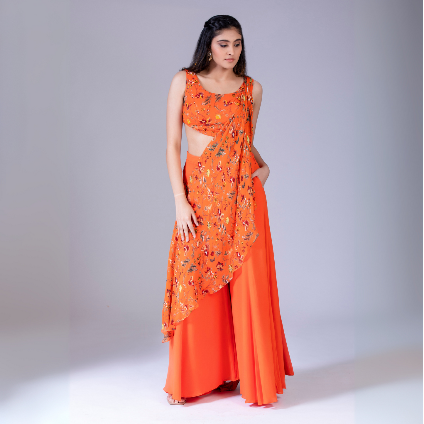 Orange printed embroidered blouse, plain sharara & printed saree drape