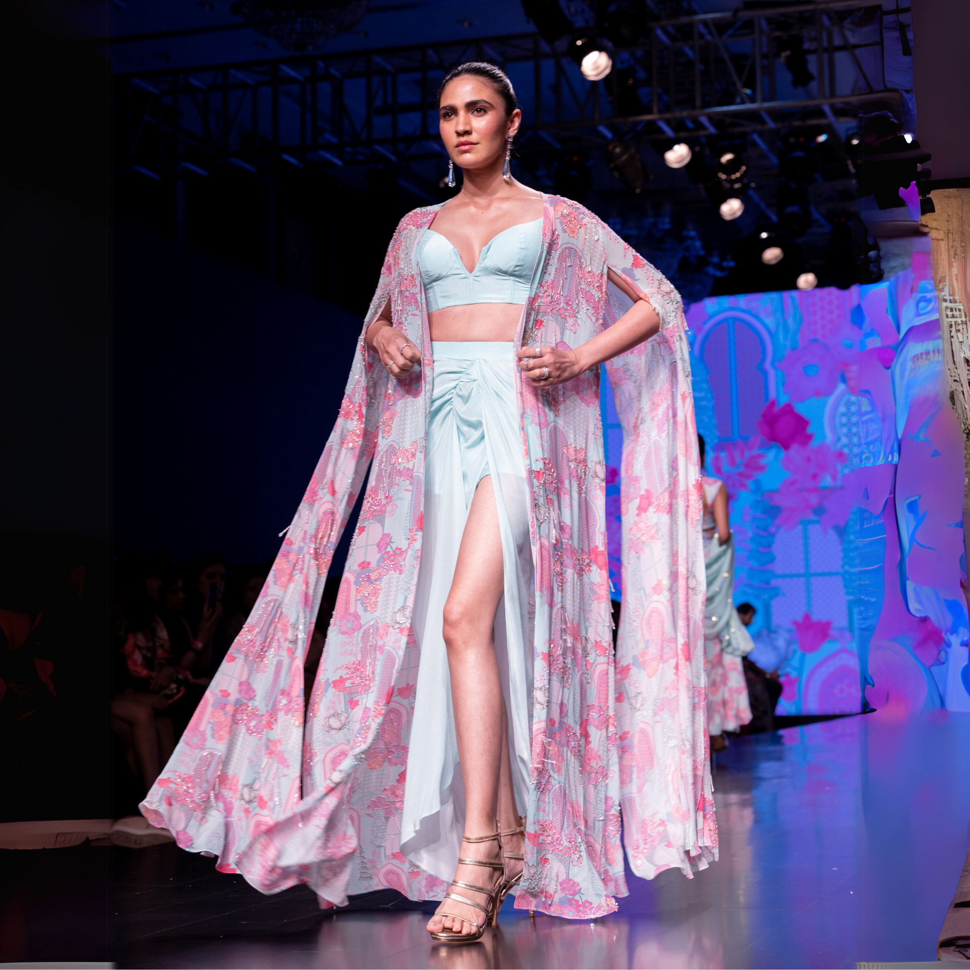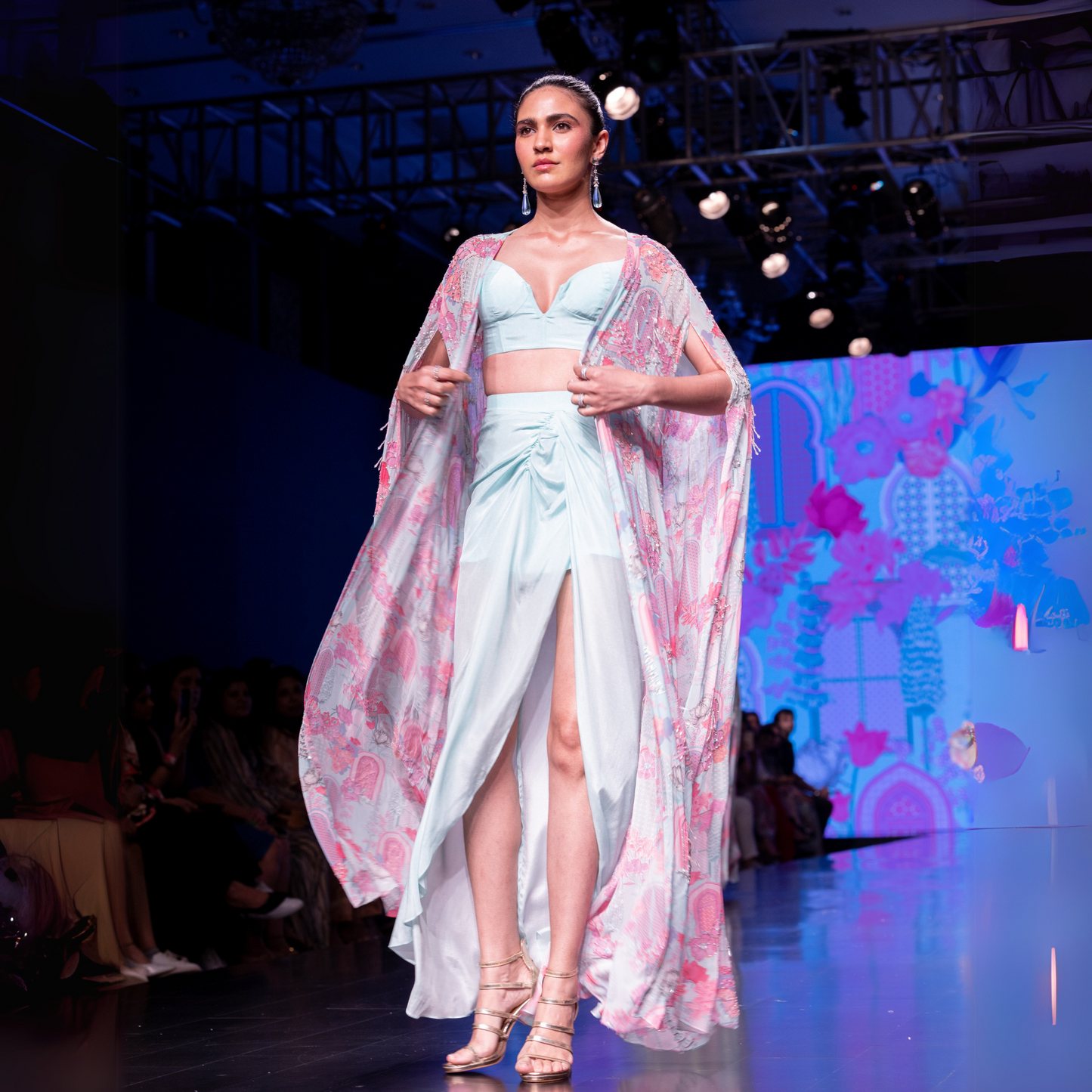Powder blue blouse with dhoti skirt paired with printed embroidered cape.