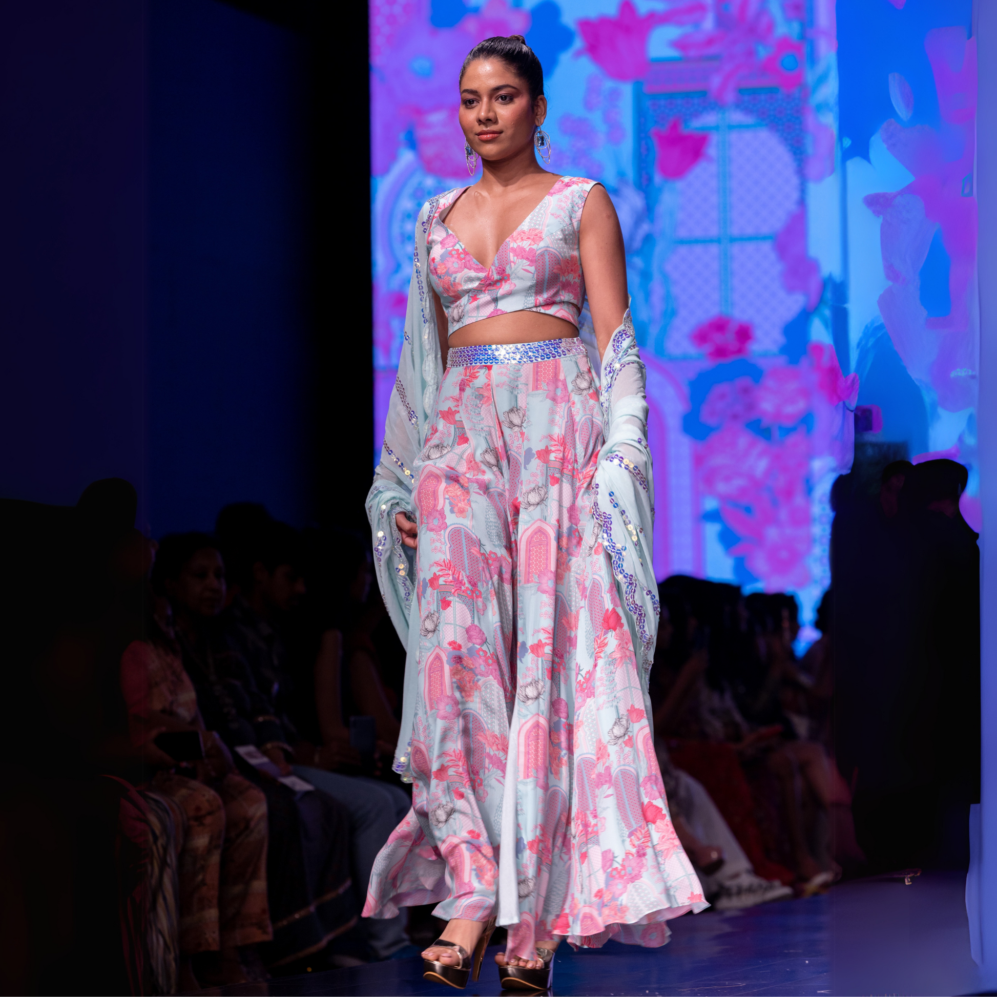Powder blue embellished criss cross blouse paired with lehenga & dupatta.