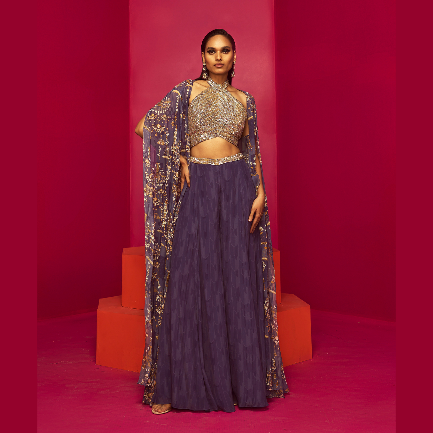 Sequence halter neck blouse paired with sharara and embellished cape set