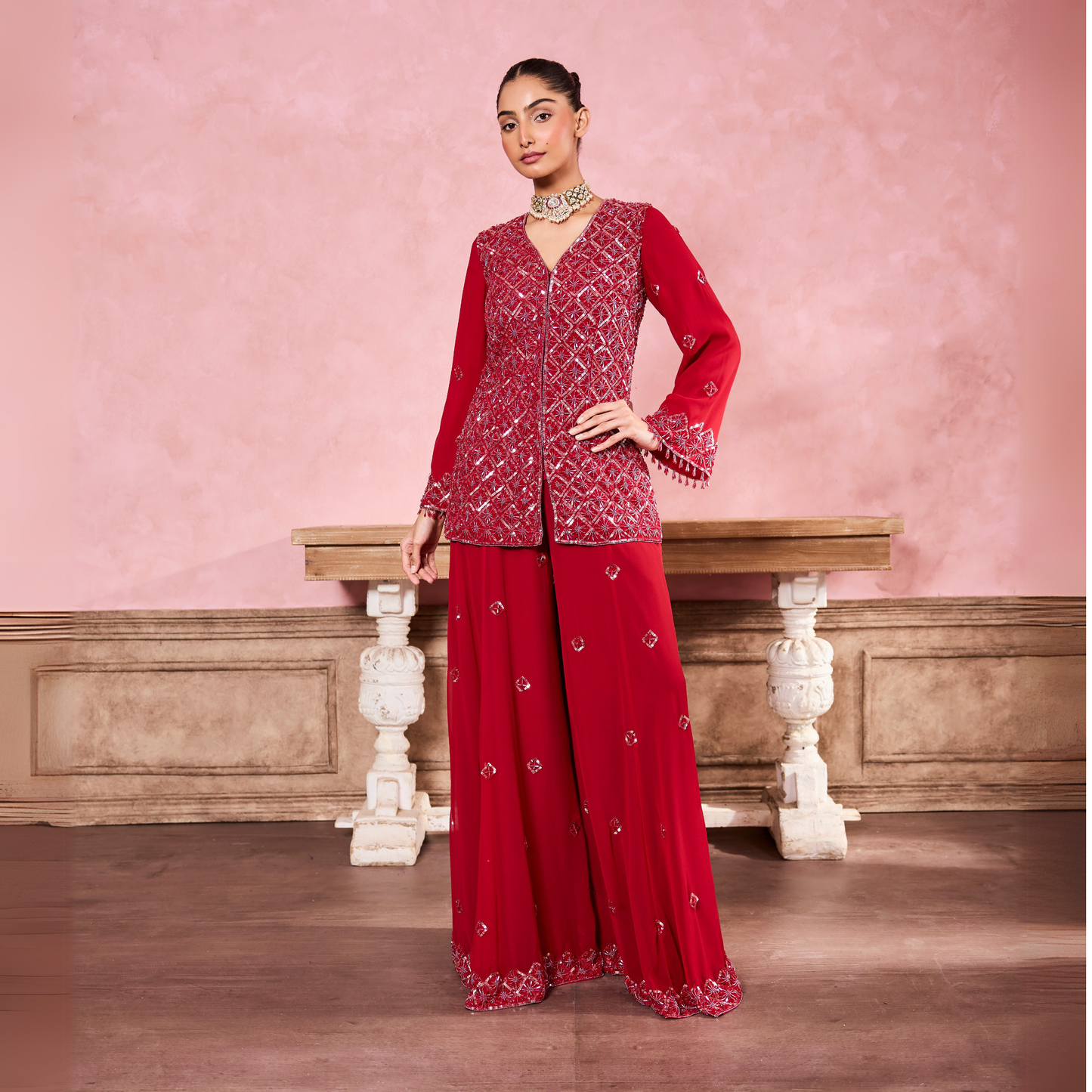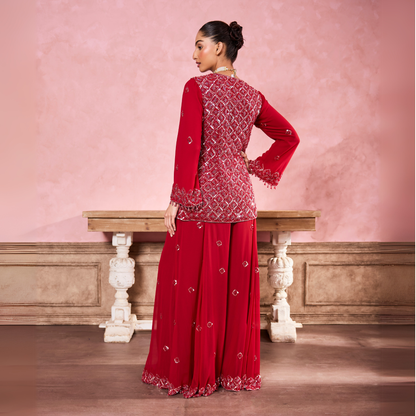 Red Hand Embroidered Sharara Set